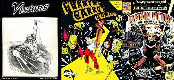 1979 brought us The Flaming Carrot, with an origin of "Having read 5,000 comics in a single sitting to win a bet, this poor man suffered brain damage and appeared directly thereafter as — the Flaming Carrot!" The Carrot first appeared in Visions #1, finally starring in his own on-shot comic in 1981. 1981 also brought us an independent series from Jack Kirby, the "King of Comics". It is somewhat appropriate that a man who was a key creator in the Golden Age of Comics, co-creating Captain America in 1940 with Joe Simon, and who heralded the arrival of the Silver Age by co-creating the majority of the Marvel Universe with Stan Lee, was there at the birth of Indie comics with his creation Captain Victory and the Galactic Rangers in November 1981.