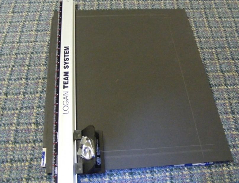 The cutter itself is guided by a straight edge and uses a razor to cut the matte. It's advised you make your cuts on a surface that you don't mind cutting into, i.e. not grandma's dining room table. Lay down some old scrap mattes or some other disposable material under your work. Like this: